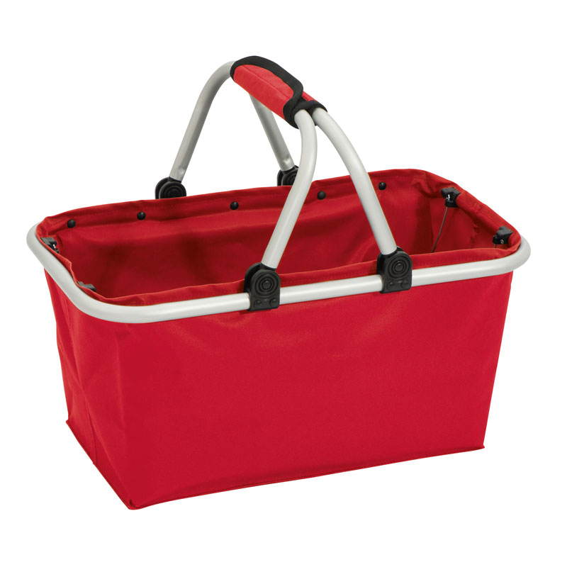 Faltbarer Einkaufskorb aus Polyester und Aluminiumgestänge. Ein nützlicher Begleiter, der sich zusammengefaltet platzsparend lagernd lässt. Ihre Werbung drucken wir auf eine Seite.