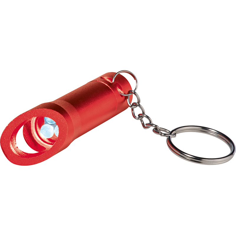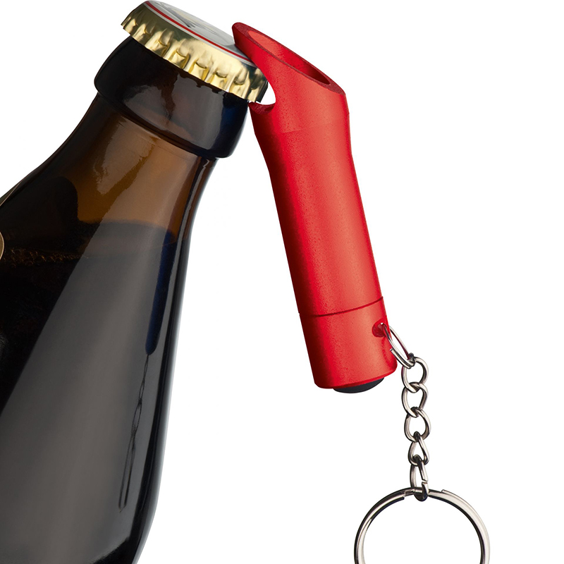 LED-Schlüsselanhänger mit Flaschenöffner aus Metall. Ihre Werbung gravieren wir auf den Korpus.